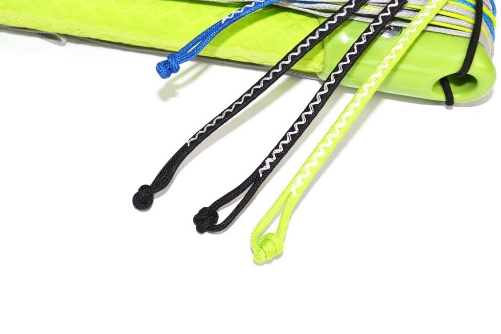 - "pig tails" intégrés aux boucles des extrémités, très pratiques si votre aile est munie de détrompeurs (exemple : noeuds pour les arrières et boules pour les avants). Exemple : une aile Cabrinha comporte des nœuds pour les arrières et des boucles pour les avants. Vous connectez la barre universelle directement à l'aile.